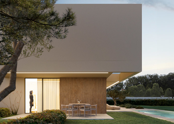 Het huis slingert zich om een privé, beschermde patio, waardoor een natuurlijke uitbreiding van de woonruimte ontstaat waar u kunt genieten van ochtendkoffie of avondbijeenkomsten onder open lucht.