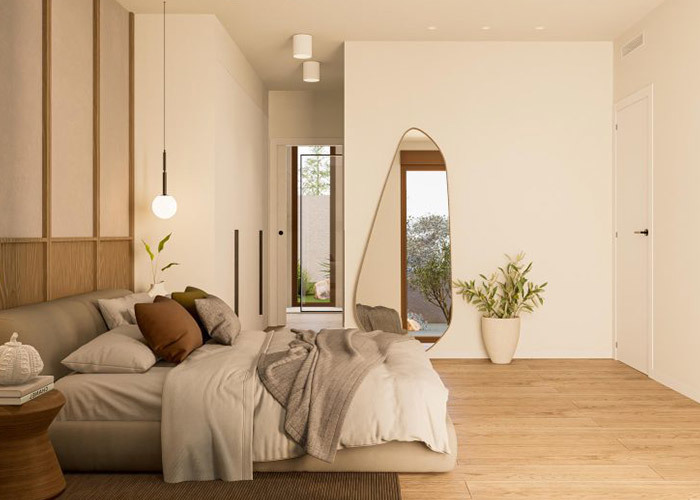 De entree vindt plaats via een royaal bemeten woonruimte. Links biedt een slaapkamer met een aangrenzende badkamer gemakkelijke accommodatie, geschikt voor gasten of familieleden die de voorkeur geven aan gelijkvloers wonen. Rechts zijn de keuken en eetruimte gepositioneerd als een geïntegreerde ruimte voor dagelijks gebruik.