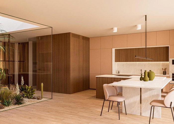 Gelegen op een royaal perceel van 27 bij 26 meter, biedt het Suva Huis ongeveer 347 vierkante meter aan interne leefruimte. De H-vormige indeling genereert vier afzonderlijke vleugels die vanuit een centrale ruggengraat uitstralen, waarbij de tussenruimtes tussen deze volumes beschutte buitenruimtes vormen. De centrale binnenplaats, gepositioneerd in het hart van de woning, biedt de mogelijkheid voor een zwembad, waardoor een focuspunt ontstaat dat vanuit meerdere interieurruimtes zichtbaar is.